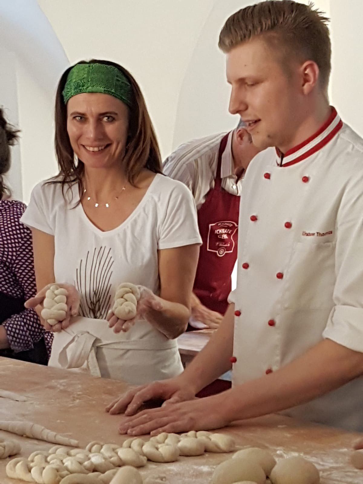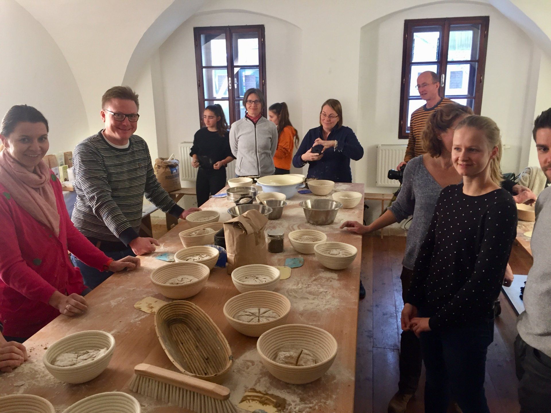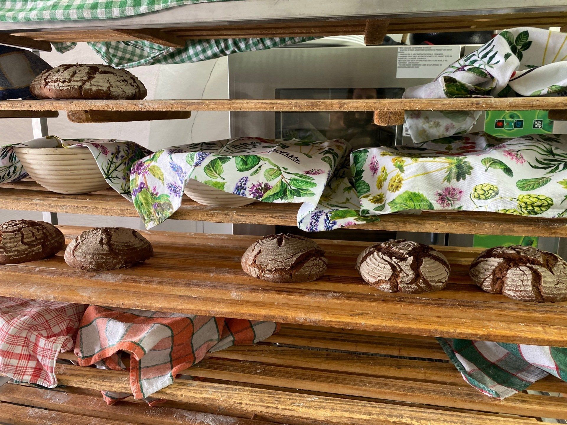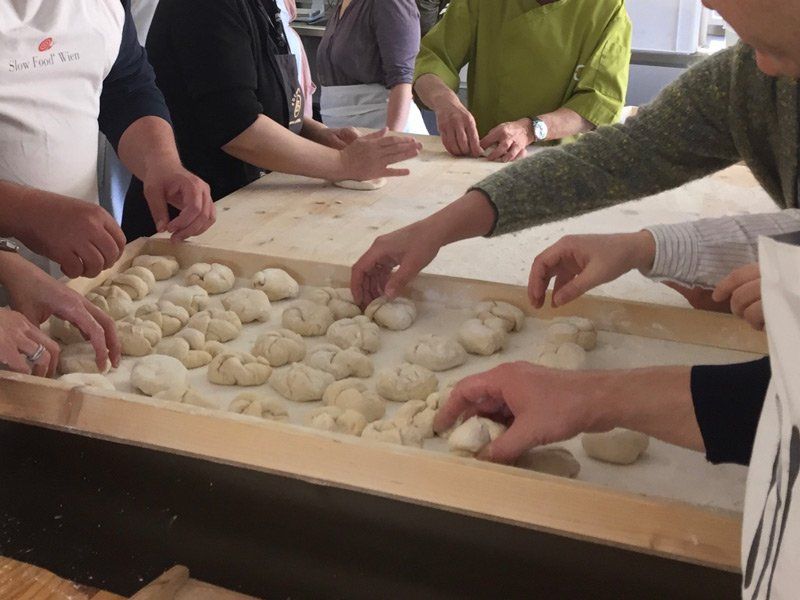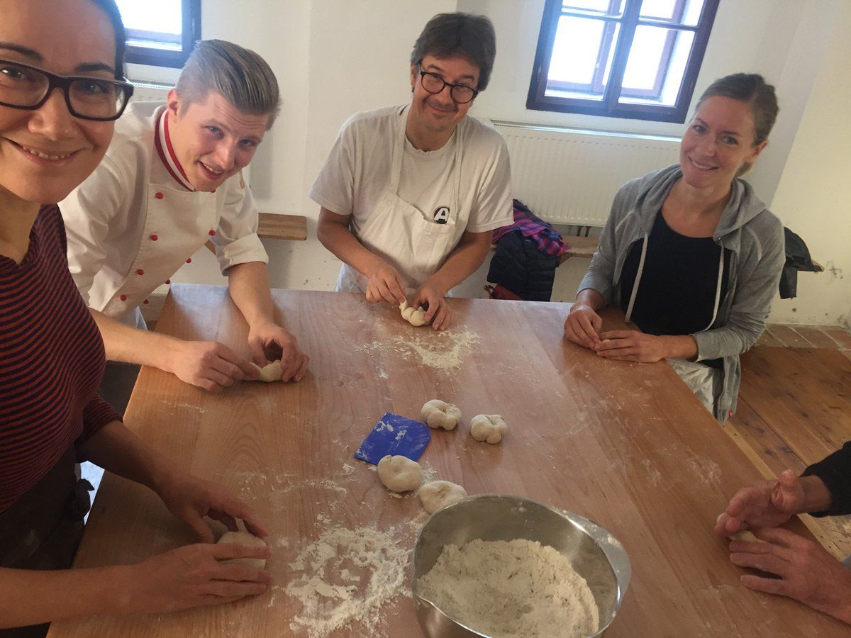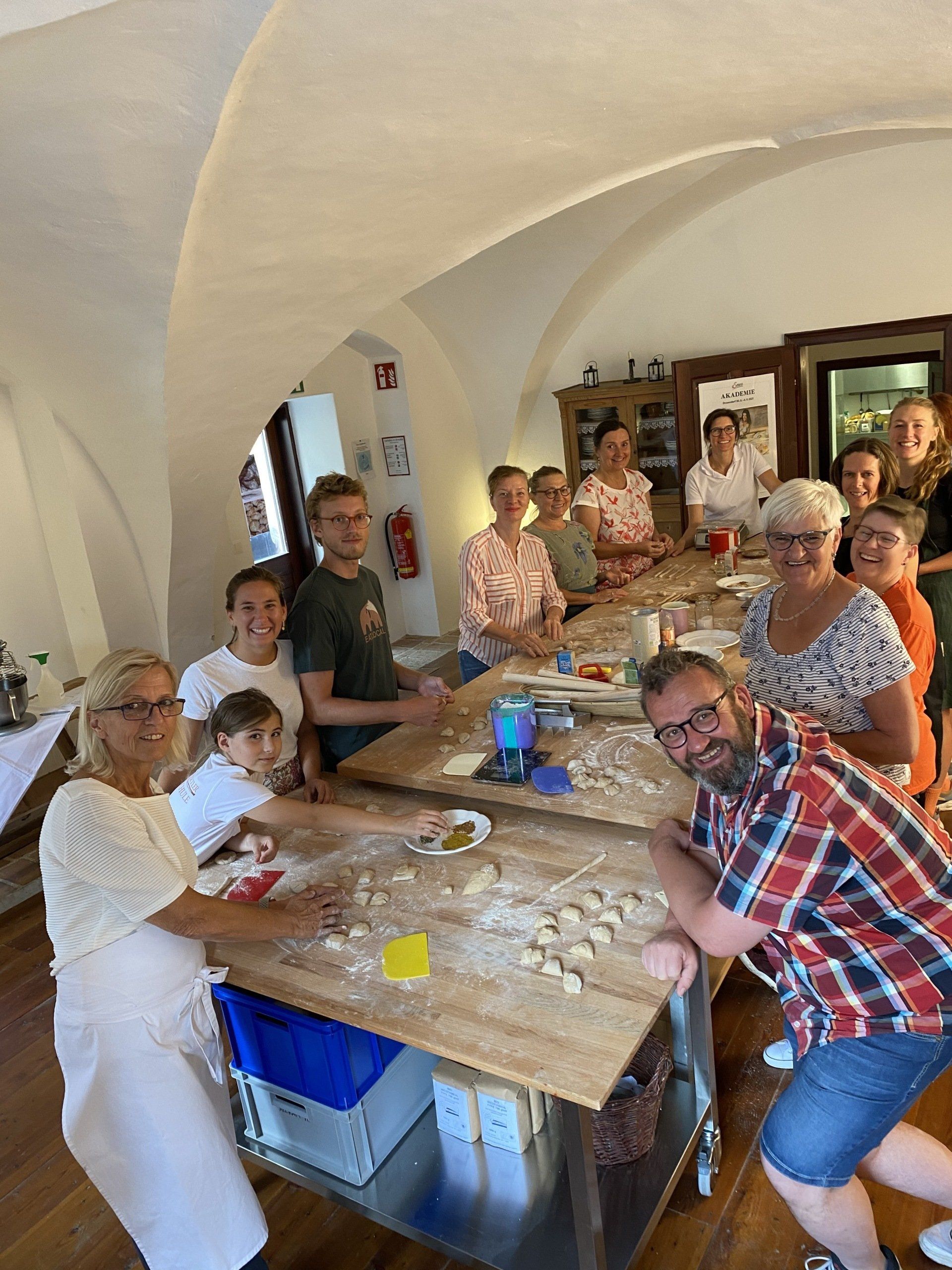 Kürzlich ging der Sauerteig mal wieder auf Reisen. Die Erste Waldviertler Bio-Backschule war eingeladen, Workshops im Rahmen eines Treffens der Mitarbeiter der niederösterreichischen Kulturgesellschaft NÖKU abzuhalten. Und wo sonst konnte das stattfinden als vor der wunderschönen Kulisse von Schloss Grafenegg & Wolkenturm . So haben wir zur Abwechslung auf dem grünen Rasen gewerkt - und der Sauerteig spielte unter den doch nicht alltäglichen Bedingungen hervorragend mit. Danke, lieber Benny! Ja, so heißt er tatsächlich, seit meine Tochter ihm diesen Namen verliehen hat … Im Rahmen dieses NÖKU-Gruppentages gab es also die Möglichkeit, eigenes Bio-Sauerteigbrot mit uns zu backen. (Darüber hinaus gab‘s übrigens ebenfalls ein sehr tolles Programm vom Besuch einer Probe der großartigen Tonkünstler über Schlossführungen bis zu Vorträgen zu Nachhaltigkeit, Ernährung oder Upcycling.) Wir haben in zwei Durchgängen am grünen Rasen geknetet und geformt, dass das Mehl nur so staubte und der Andrang in unserem Zelt war groß. Nach Teigmischen, Formen und einer Rast im Simperl wurden zu guter Letzt tatsächlich 2 x 20 Brote mit dem E-Caddy zum benachbarten Restaurant Mörwald gefahren und dort gebacken. Vielen Dank bei der Gelegenheit auch noch an Küchenchef Jörg und sein Team!! Die duftenden Endergebnisse konnten anschließend alle mit nach Hause nehmen und wir hoffen, Ihr habt es genossen. Ein wenig könnte wir noch an ein paar Feinheiten (aka Zuhören) feilen – 2 Kaffeelöffel Salz sind NICHT 2 Esslöffel … Aber das kriegen wir hin :) Wir haben uns jedenfalls außerordentlich über das rege Interesse am Brotbacken gefreut und Benny lässt ausrichten, wir kommen gerne wieder.