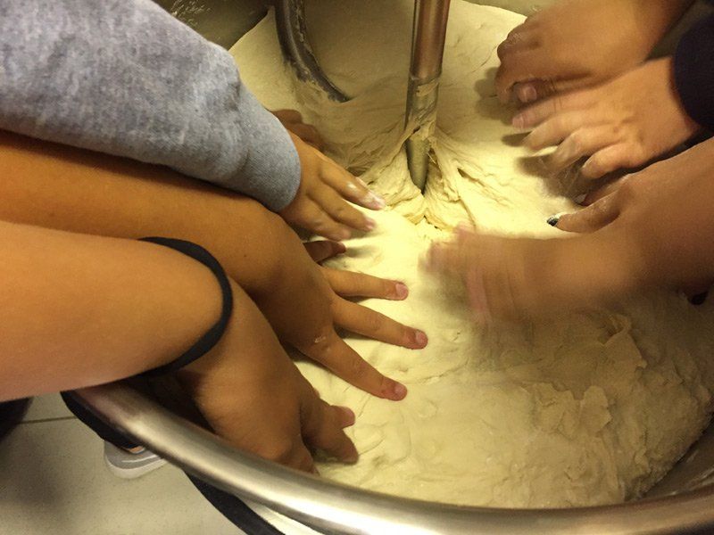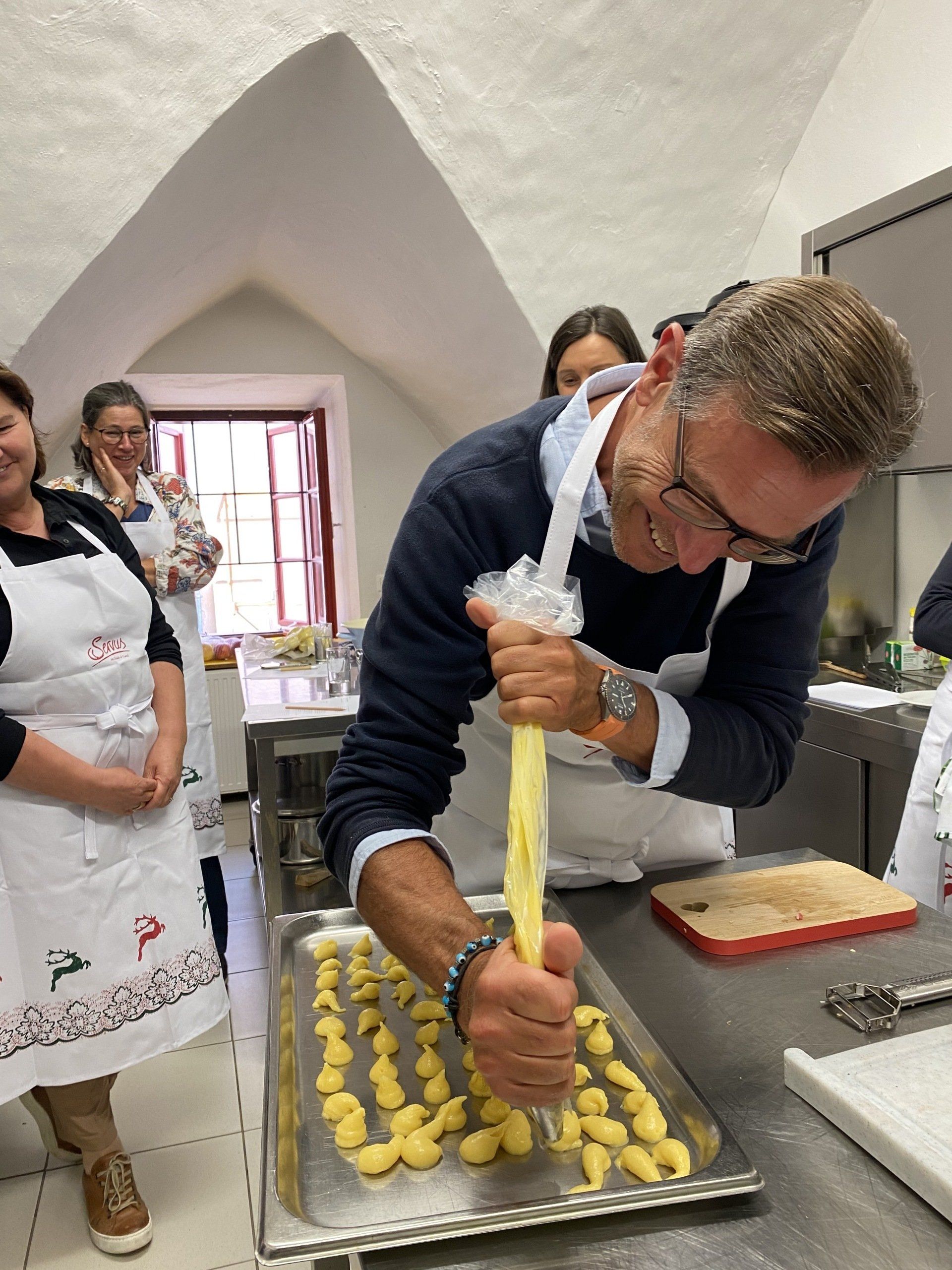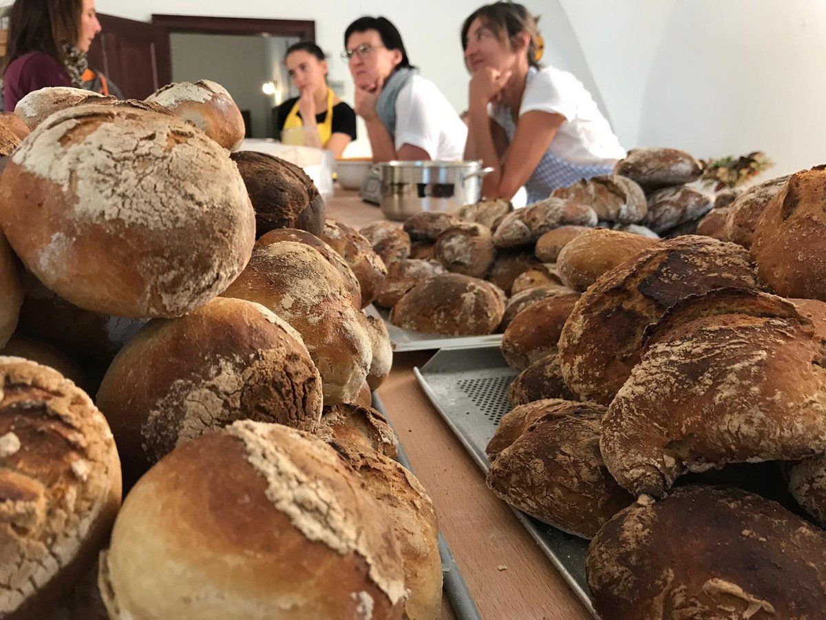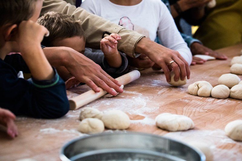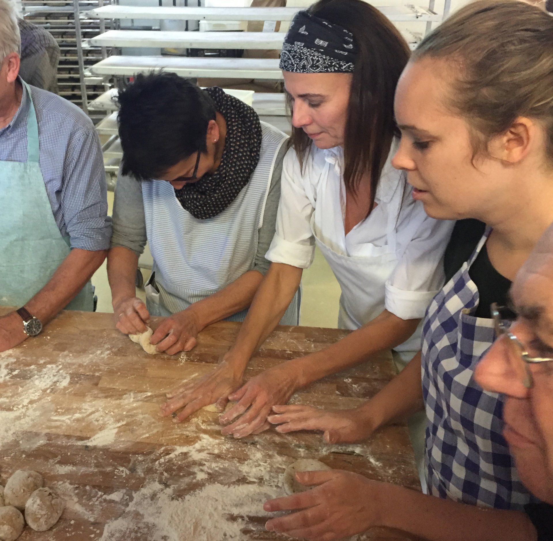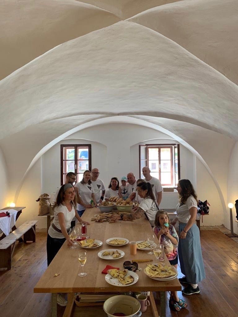 Kürzlich ging der Sauerteig mal wieder auf Reisen. Die Erste Waldviertler Bio-Backschule war eingeladen, Workshops im Rahmen eines Treffens der Mitarbeiter der niederösterreichischen Kulturgesellschaft NÖKU abzuhalten. Und wo sonst konnte das stattfinden als vor der wunderschönen Kulisse von Schloss Grafenegg & Wolkenturm . So haben wir zur Abwechslung auf dem grünen Rasen gewerkt - und der Sauerteig spielte unter den doch nicht alltäglichen Bedingungen hervorragend mit. Danke, lieber Benny! Ja, so heißt er tatsächlich, seit meine Tochter ihm diesen Namen verliehen hat … Im Rahmen dieses NÖKU-Gruppentages gab es also die Möglichkeit, eigenes Bio-Sauerteigbrot mit uns zu backen. (Darüber hinaus gab‘s übrigens ebenfalls ein sehr tolles Programm vom Besuch einer Probe der großartigen Tonkünstler über Schlossführungen bis zu Vorträgen zu Nachhaltigkeit, Ernährung oder Upcycling.) Wir haben in zwei Durchgängen am grünen Rasen geknetet und geformt, dass das Mehl nur so staubte und der Andrang in unserem Zelt war groß. Nach Teigmischen, Formen und einer Rast im Simperl wurden zu guter Letzt tatsächlich 2 x 20 Brote mit dem E-Caddy zum benachbarten Restaurant Mörwald gefahren und dort gebacken. Vielen Dank bei der Gelegenheit auch noch an Küchenchef Jörg und sein Team!! Die duftenden Endergebnisse konnten anschließend alle mit nach Hause nehmen und wir hoffen, Ihr habt es genossen. Ein wenig könnte wir noch an ein paar Feinheiten (aka Zuhören) feilen – 2 Kaffeelöffel Salz sind NICHT 2 Esslöffel … Aber das kriegen wir hin :) Wir haben uns jedenfalls außerordentlich über das rege Interesse am Brotbacken gefreut und Benny lässt ausrichten, wir kommen gerne wieder.